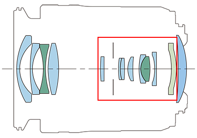 The lens configuration of the RF15-30mm f/4.5-6.3 IS STM at the wide end (15mm). The lens groups in the red frame move during zooming.