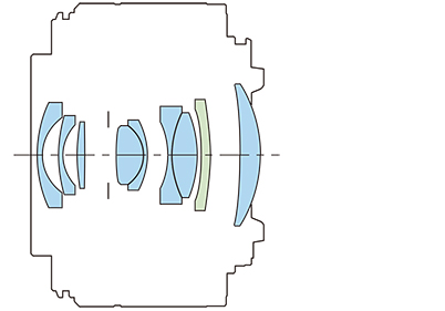 The lens configuration of the RF16mm f/2.8 STM. Like the RF15-30mm f/4.5-6.3 IS STM, this is an ultra-wide-angle lens; however, less space is needed as the lens has no zoom elements.