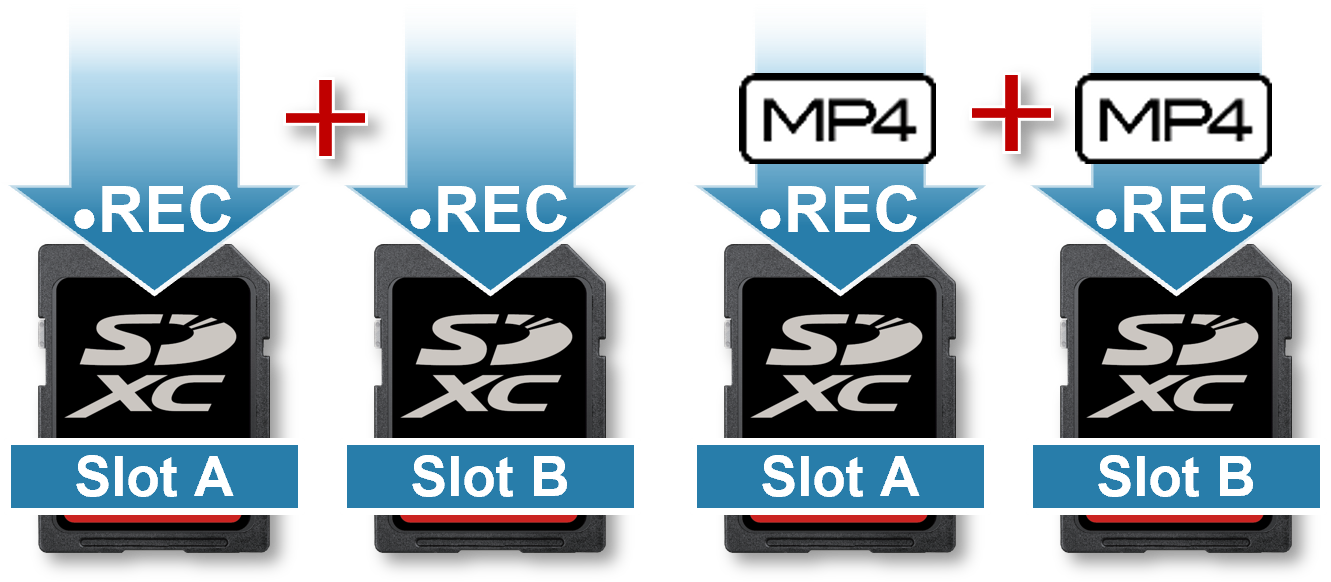 The dual cards slots can be utilized to enable seamless recording across two cards. Relay recording from slot B to slot A is also supported. Separate files can be seamlessly merged into one video file using the MP4 Join Tool.