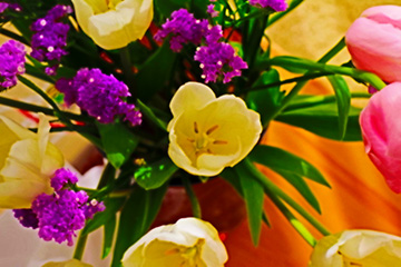 Applying [Soft focus] first helps to moderate the powerful [Art bold effect], thereby bringing out the vivid colours of the flowers.
