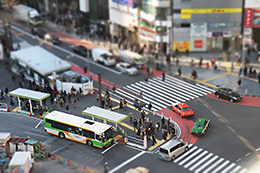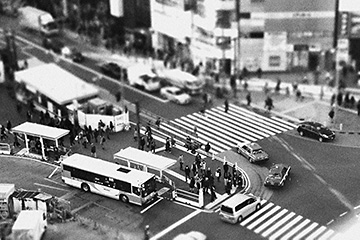 First, I miniaturised the townscape with [Miniature effect], and then applied [Grainy B/W] to make the image evoke the memories of the good old days.