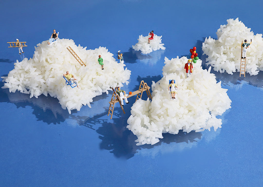 To create puffy clouds, use cooked Jasmine/Japanese rice. Be gentle when you knead the cooked rice together so to keep every pearl in shape; you don’t want broken bits of rice that look unappealing in photos. Couple that with a blue background and you will get yourself a nice blue sky with white clouds.