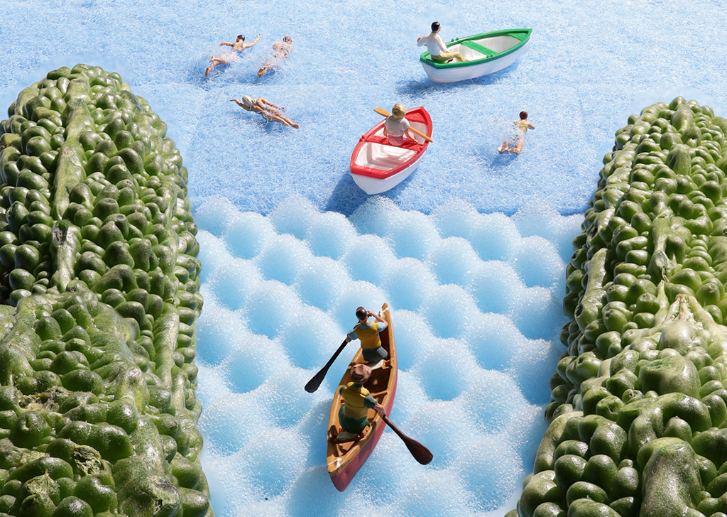Rivers, valleys and the ocean… these are made using simple tools such as sponges and bitter gourds. Make sure you get sponges with the right texture – in this case, a wavy one with a hint of white and blue. We used bitter gourds for its rough skin texture to emulate the cliffs and rocks that you see along a coast. With an RF35mm f/1.8 IS Macro STM lens, we managed to capture amazing macro shots in stills and videos, just like the ones you will see in the video below.
