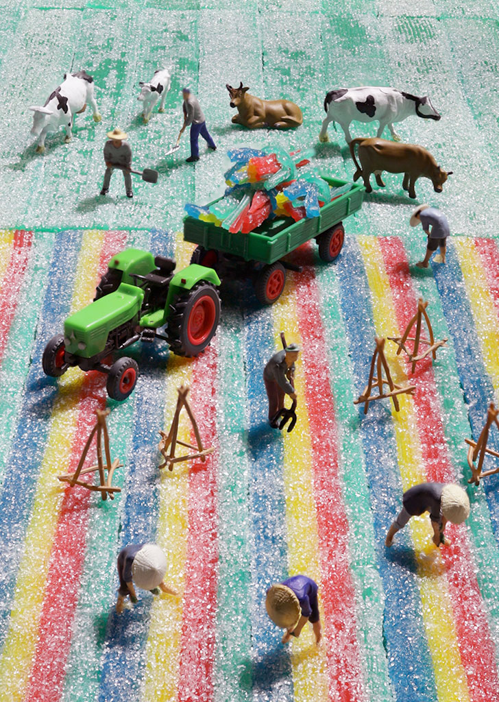 Creating green pasture is easy – choose rough green sponges and stick them together to form your desired size. For the rice plantation in this photo, we use candy speckled with sugar to give the shot texture, colours, and depth. Things need not be exactly the same as you see in real life, you can be a little abstract (e.g. different colours) in the shots you want to create – and that’s the beauty of photography.