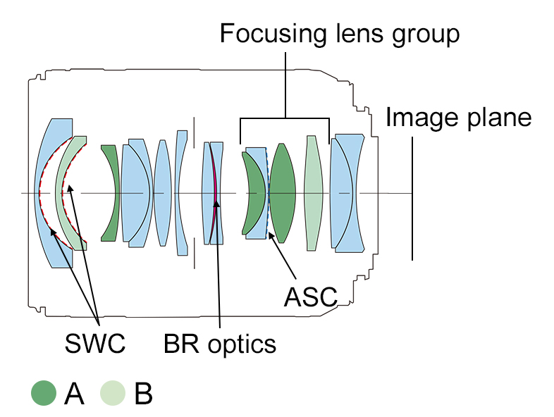 RF20mm f/1.4L VCM lens configuration A: Super UD lens/UD lenses B: GMo (glass-moulded) aspheric lenses