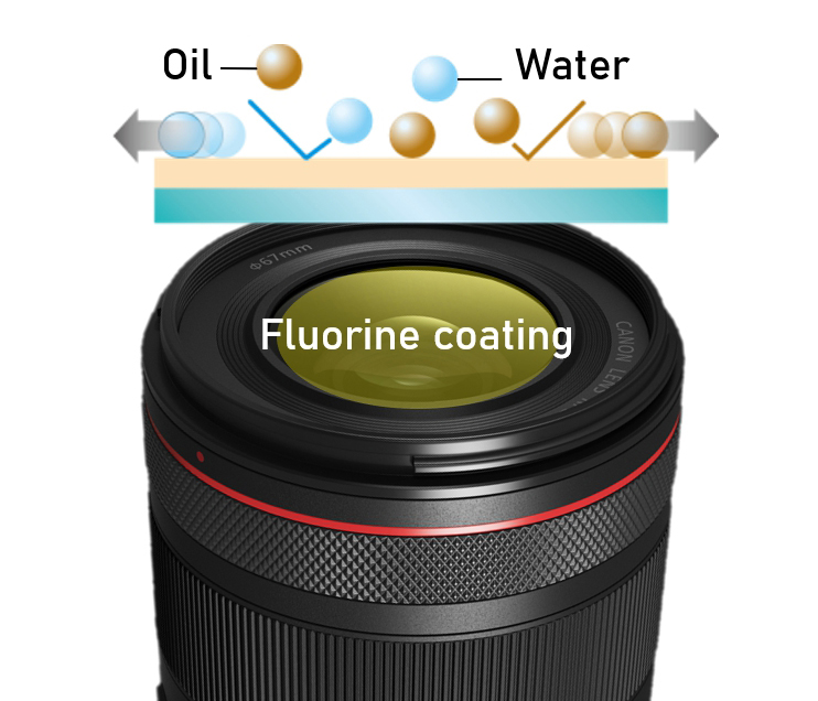 Smudge-resistant fluorine coating on the frontmost element prevents dust and dirt from sticking onto the lens, and allows them to be easily wiped off with a cleaning cloth.
