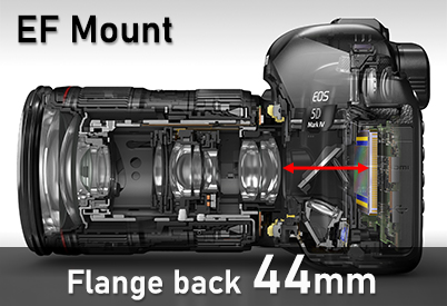To avoid blocking mirror movement, EF lenses must have a back focus distance of at least 44mm.