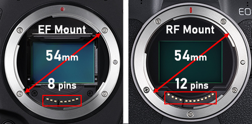 The RF and EF mounts have the same 54mm mount diameter. A larger mount diameter makes it possible to use a larger lens element for the rearmost lens. This ensures that light bends less before it reaches the image sensor, therefore reducing lens aberrations.