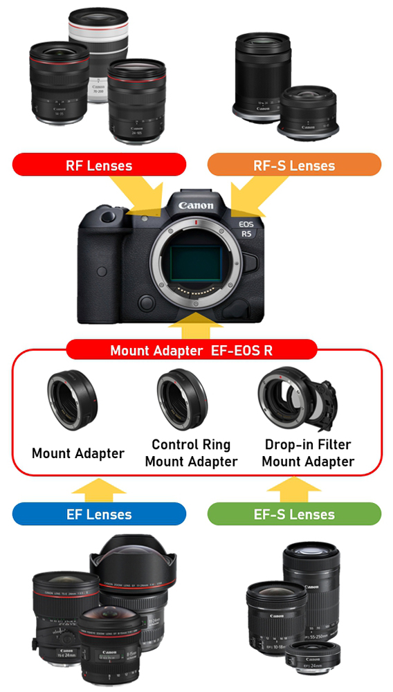 In fact, there are three different EF-EOS R mount adapters. The Control Ring Mount Adapter EF-EOS R or Drop-In Filter Mount Adapter EF-EOS R not only let you attach EF and EF-S lenses to your EOS R system camera, but also provide additional features.