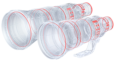 The lenses bear the iconic white heat shield coating that gives Canon’s professional telephoto lenses their “big white” nickname. The coating keeps image quality from deteriorating due to heat buildup inside the lens when shooting outside on a hot day.