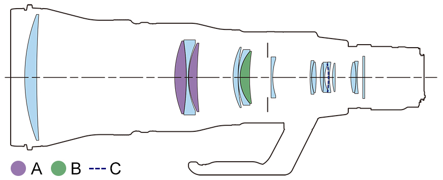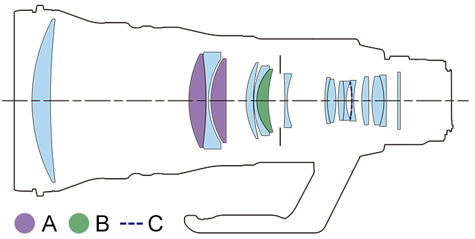 A: Fluorite lens elements / B: Super UD lens elements / C: ASC