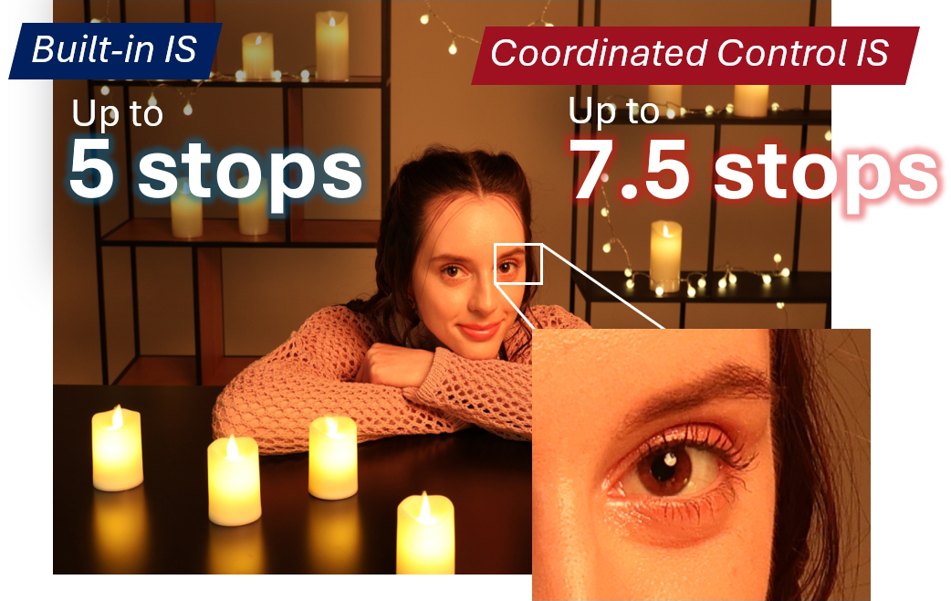 Coordinated Control IS: 5-axis image stabilisation Coordinated Control IS, where the in-lens Optical IS works in tandem with the camera’s In-Body IS and Movie Digital IS, corrects camera movement along 5 movement axes so footage shot while moving looks seamless even without a gimbal.