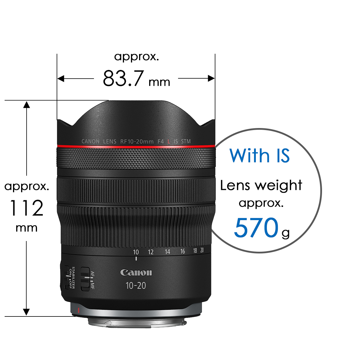 Weighing approximately 570g, RF10-20mm f/4L IS STM is an engineering feat because it not only achieves a 1mm focal length reduction over the EF11-24mm f/4L USM, but also does so while achieving a 50% weight reduction over the latter, which weighed 1108g. The newfound portability increases usage opportunities and creative possibilities.