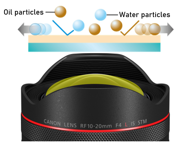 Smudge-resistant fluorine coating on the frontmost element prevents dust and dirt from sticking onto the lens, and allows them to be easily wiped off with a cleaning cloth.
