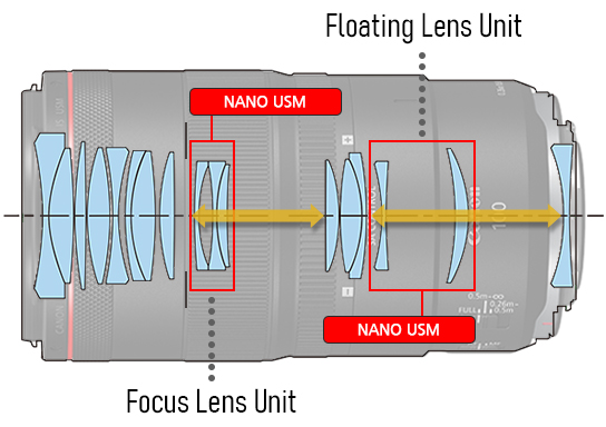 On the RF100mm f/2.8L Macro IS USM, the autofocus (AF) is driven by two independent Nano USMs that make possible an electronic floating focus control system where the focusing lens group and the floating lens groups are controlled separately. This enables the RF100mm f/2.8L Macro IS USM to balance improved functionalities such as a shorter closest focusing distance and spherical aberration control alongside core performance qualities such fast, high-precision AF. The electronic floating focus system also helps to reduce focus breathing, which causes the angle of view to change during focusing.
