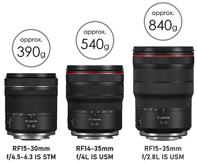 | RF wide-angle zoom lenses | RF15-30mm f/4.5-6.3 IS STM | RF14-35mm f/4L IS USM | RF15-35mm f/2.8L IS USM |