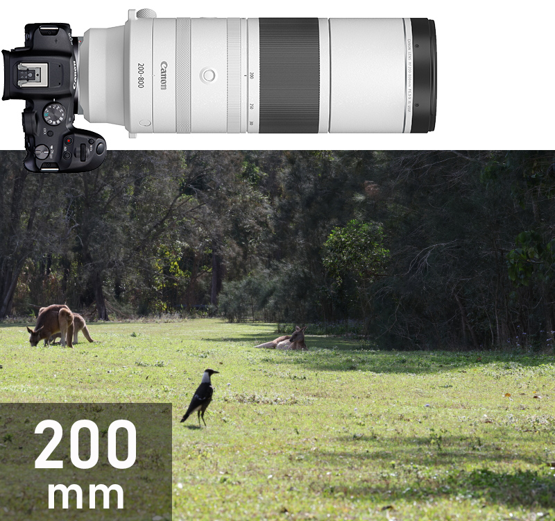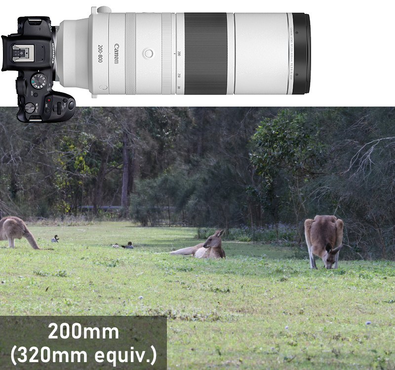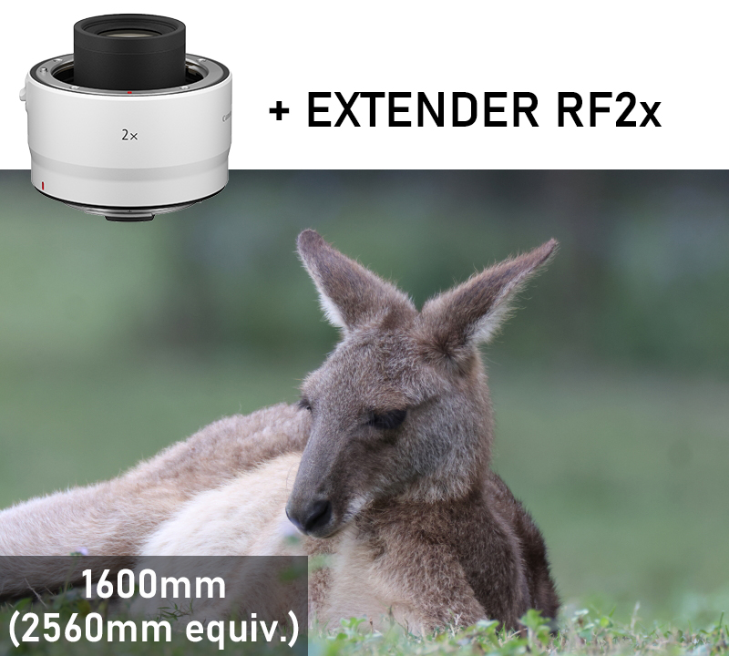 On APS-C EOS R cameras, as well as with the 1.6x crop mode on full-frame EOS R series cameras, the lens offers a coverage equivalent to 320mm to 1280mm. With the Extender RF2x, coverage of up to 2560mm equivalent is possible.