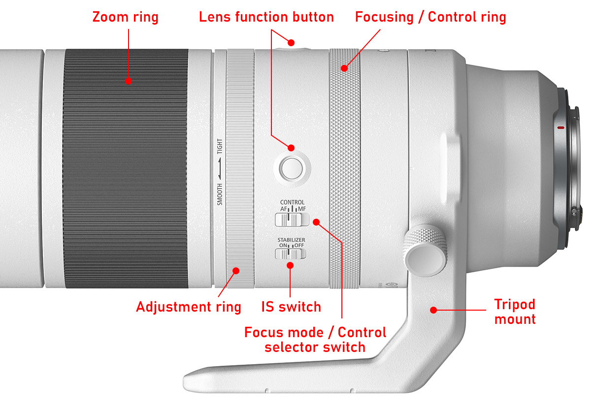 This knurled ring, a staple on RF lenses, can be assigned to control a designated exposure setting such as aperture or ISO speed. It can also be used as a focusing ring during manual focusing. On the RF200-800mm f/6.3-9 IS USM, it is located near the base of the lens for easy access.