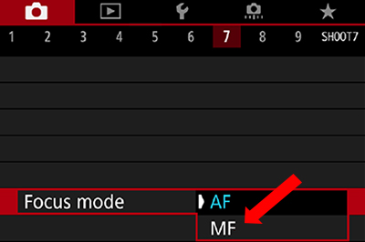 1. On your camera menu, change the focus mode to ‘MF’.