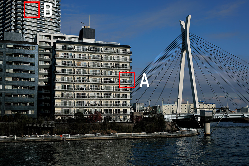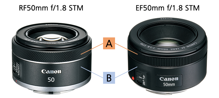 | A: Focusing ring | RF50mm f/1.8 STM Texture that feels good on the finger. Turns easily. Movement is seamless as the torque is just right. Easy to carry out precise focusing. EF50mm f/1.8 STM Slipperier for the finger. A little harder to turn, but no issues for focus adjustment. |