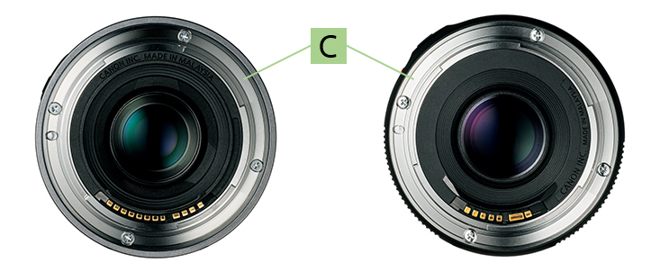 | C: Lens mount | RF50mm f/1.8 STM The metal mount is highly durable and provides a luxurious feel. The frontmost lens element protrudes slightly more than on an EF lens, but the rearmost lens element recedes more. EF50mm f/1.8 STM Until the EF50mm f/1.8 II, the mount was plastic. However, this version has a metal mount like its RF mount counterpart. |