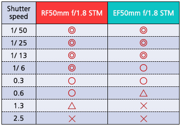 The results show that the image stabilisation effect available on the EF lens was approximately one stop below the RF lens.