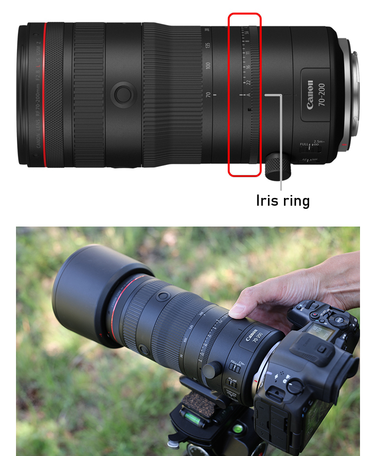 On the EOS R1 and EOS R5 Mark II, the iris ring can also be used to control aperture during still shooting.