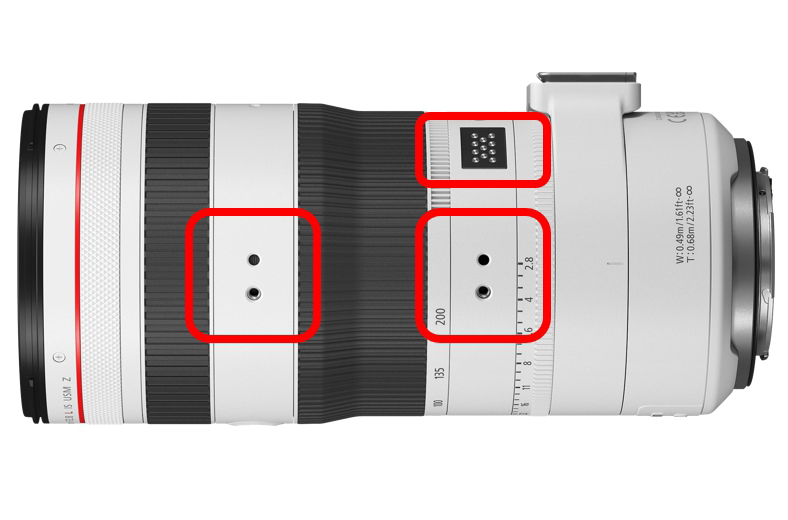 Like the RF24-105mm f/2.8L IS USM Z, the RF70-200mm f/2.8L IS USM Z has visible contacts and screw holes (in the red box) to allow accessories like the Power Zoom Adapter PZ-E2/E2B and Lens Holder LH-E1 (sold separately) to be quickly attached. Measures have been taken to ensure L-series standard weather sealing regardless of whether these are attached.