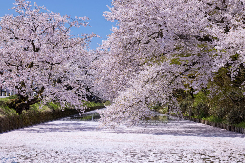 Even when the sakura are in full bloom, it’s hard to predict when the petals will fall and blanket the moat as that depends on various environmental factors. To some extent, it’s about luck! But observation skills are also crucial, so take a walk around the moats, keep your eyes open, and look out for opportunities.