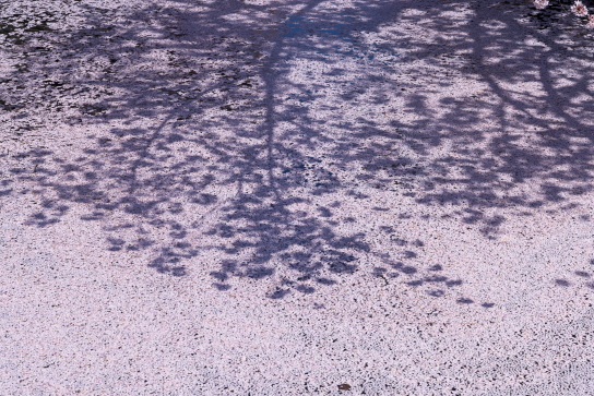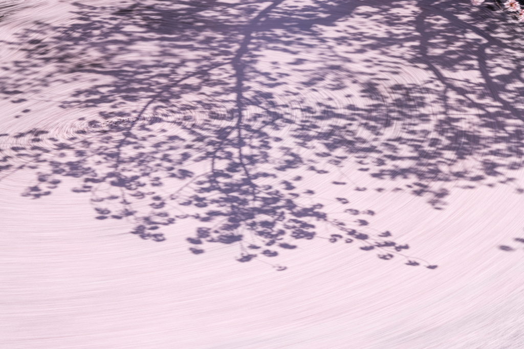 For this shot, I wanted to make use of the clean silhouettes of the sakura branches and blossoms that the late morning sun cast onto the thick layer of floating petals.