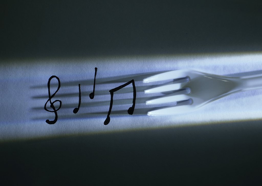 In the above image, a shadow formed when the photographer shone a torchlight against a plastic fork on a white background. It resembled a music sheet, so the photographer drew a treble symbol and lyrical notes as elements to bring his idea to life.