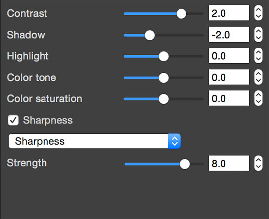 I used Digital Photo Professional to post-process the RAW data, with Contrast set to 2, Sharpness to 8 and Shadow to -2 to produce a clear image of the stars and the light trails. You can also increase the brightness level if necessary.