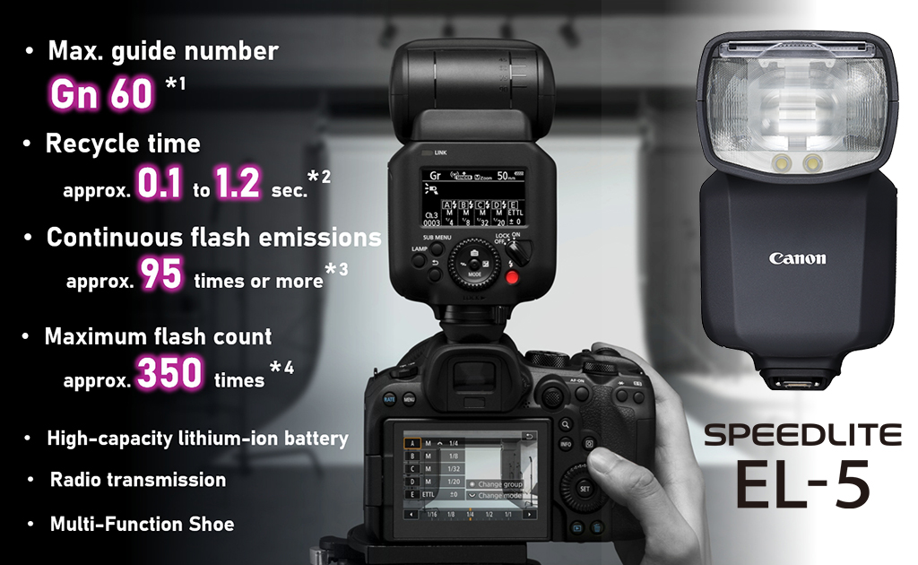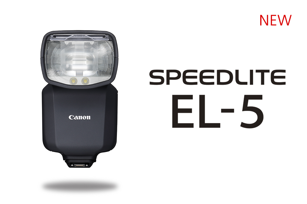 Like the flagship Speedlite EL-1, the Speedlite EL-5 has a high-capacity lithium-ion battery, and boasts powerful output, fast recharging, and high continuous flash capabilities. All these are provided in a smaller, lighter body, made possible by streamlining to remove older features like optical transmission for wireless flash,retaining only widely used features and those poised to become mainstream in the future, such as radio transmission. With this, the Speedlite EL-5 achieves performance above that of the Speedlite 600EX II-RT, the most advanced model in the Speedlite EX series, but at a price point below the latter.