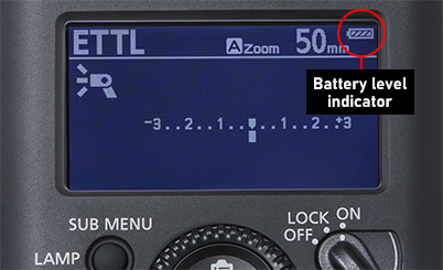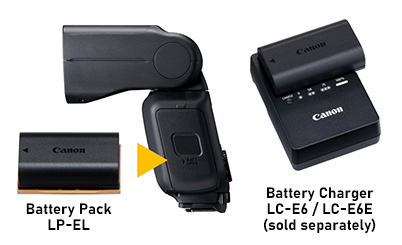The display panel shows the remaining battery level so you know when it’s time to charge, avoiding unwelcome disruptions to your workflow. No charger is included. However, if you use a camera powered by an LP-E6 series battery—which describes most enthusiast and advanced EOS cameras—there shouldn’t be a problem: you can use the same charger to charge your Speedlite EL-5 battery.
