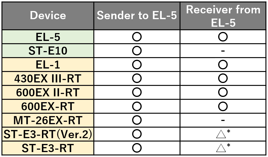 The Speedlite EL-5 is compatible with all existing Canon Speedlites that support radio transmission. If your camera does not support the new Multi-Function Shoe, you still can use the Speedlite EL-5 as a receiver, with a Speedlite or transmitter that supports the old hot shoe as the sender.