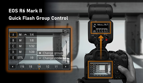 The EOS R6 Mark II is equipped with the new Quick Flash Group Control menu feature that allows you to configure output settings for flash groups on a Live View display overlay. With this, making adjustments during wireless flash photography is quicker and more intuitive: simply use the camera’s dials and buttons to make adjustments, while keeping the Live View preview always in sight.