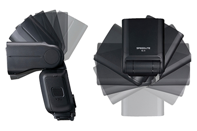 The flash head of the Speedlite EL-5 can be rotated 120° upwards, 7° downwards, and 180° to the left and right—same as the Speedlite EL-1. This is 30° more in the upward direction than the 90° possible on the Speedlite 600EX II-RT.