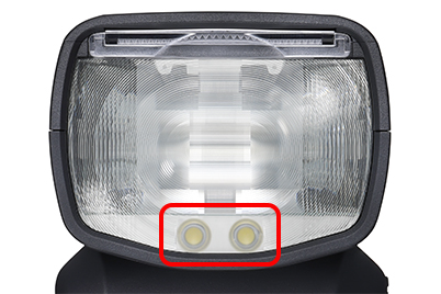 The bottom of the flash head features two LED lights that do double duty as AF assist lights and modelling lights. The AF assist lights have adjustable output: when the Speedlite EL-5 is used with a compatible camera, their brightness will change according to the ambient brightness so that human subjects will not find them too bright.