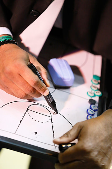 A whiteboard for conveying the tactics to the players. From the tense fingers, viewers can tell the expression of the coach and players who were listening carefully.