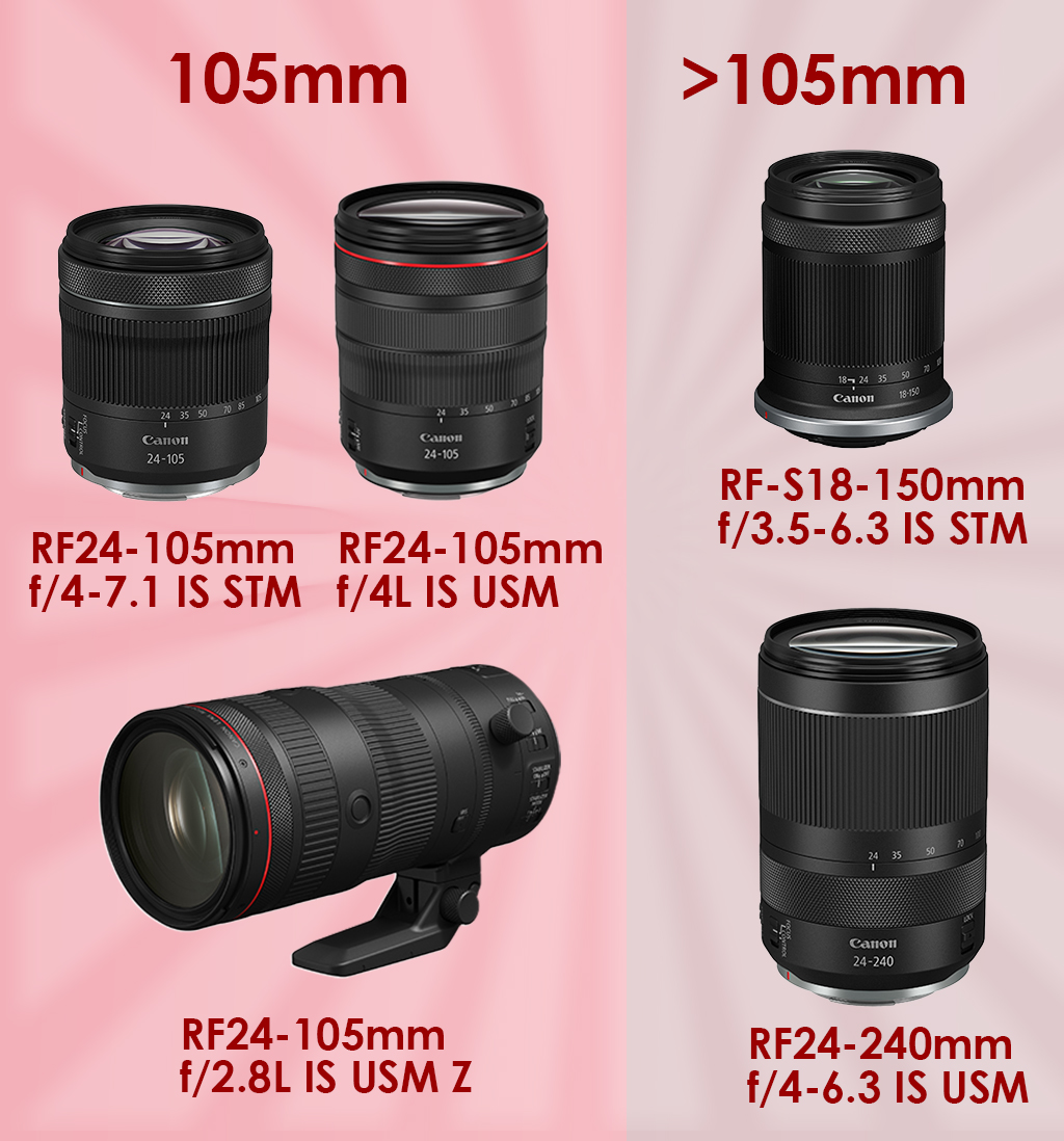 RF24-105mm f/4L IS USM RF24-105mm f/4-7.1 IS STM RF24-105mm f/2.8L IS USM Z | 38.4-168mm | 24-105mm |