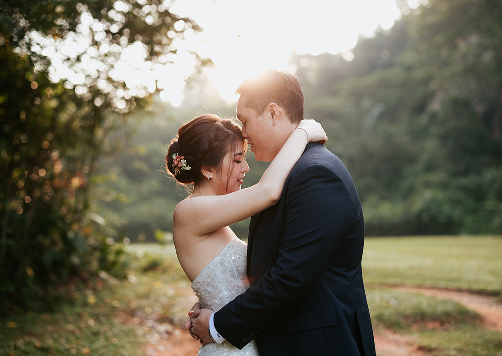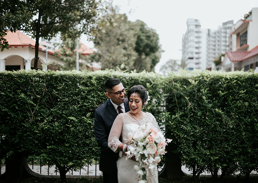 A good starting pose is asking the groom to hug his bride from behind. You can get them to look at each other and even have the groom give the bride a cheeky squeeze or peck on the neck for a more intimate photo.