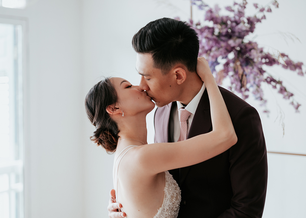 All that's required is to ask the groom to stand in front of his partner. From here, there are two different options for the groom. You can either ask him to place his right hand on her back or use it to gently cradle her face. Next, ask the bride to rest her hand on the back of his neck. You don’t have to get the couples to display full-blown tongue action, just a few pecks will do.