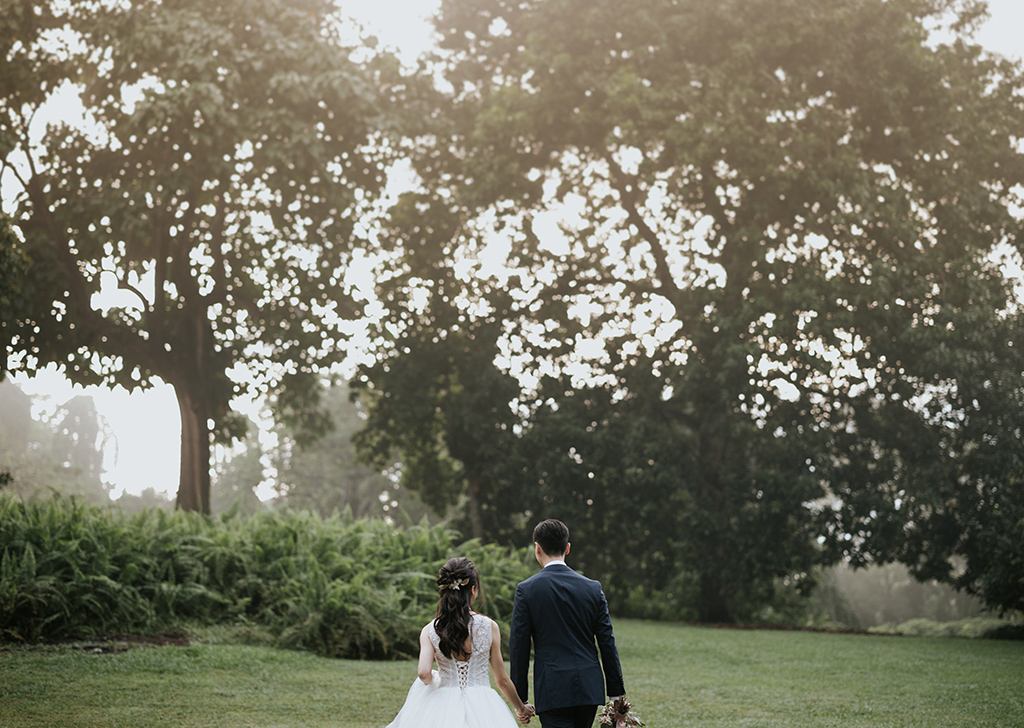 If you have a wide angle lens, it will definitely be easier as the lens was made to include more background in one’s shots! Have the couple walk and position them around one-third of the way from yourself to the composition background. Ask the bride and groom to hold hands and look out at the scene in front of them. Typically, these shots will include a landscape or even the chapel as the background.