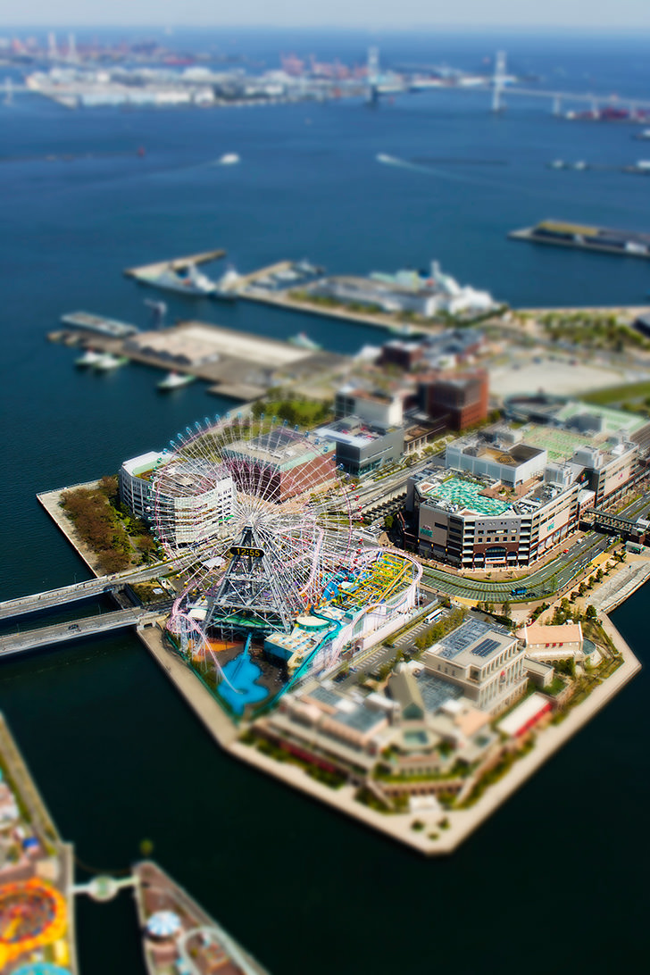 Point the camera downward to create a stronger top-down perspective. The miniature effect will be enhanced at a higher shooting angle. Also important in such a shot is focusing. In the example above, I set focus on the Ferris wheel while blurring the top and bottom areas.