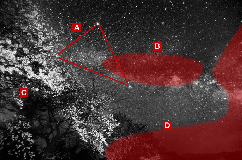 Here, the key point lies with how you control the colours of the Milky Way and cherry blossoms, as well as the contrast and balance in brightness. To reduce colour cast caused by the artificial lights, create a vignette effect using masking.