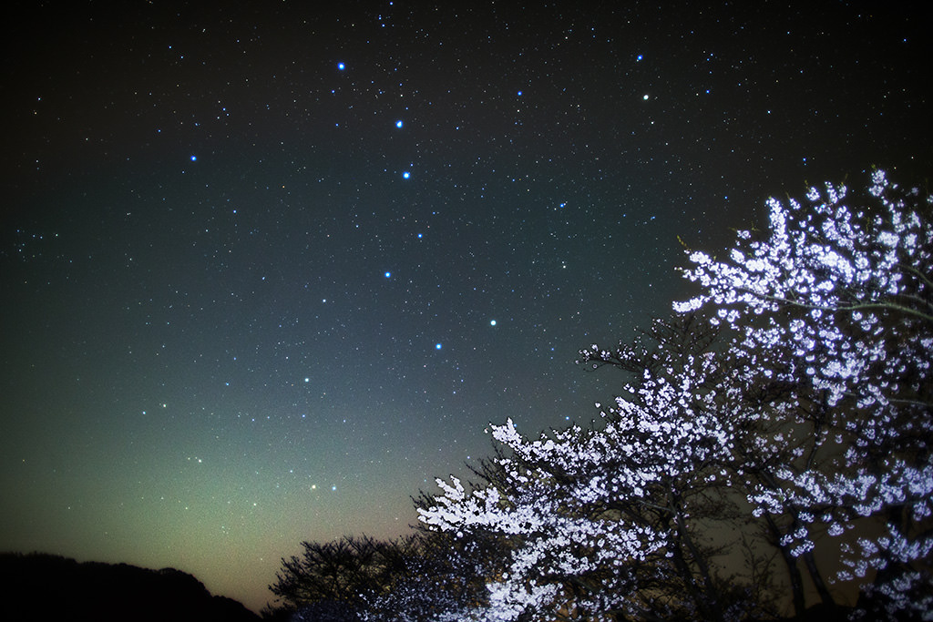 In Japan, on a hot summer night you can find the bright Milky Way high up in the eastern sky and the Scorpius in the south. When Mars is glowing brightly in red and moving closer to the head of the “scorpion”, look to the northwest direction and you will find the Big Dipper hanging down and shining brilliantly. Combining the cherry blossoms with the Big Dipper creates an ambience that is different from that with the Milky Way.