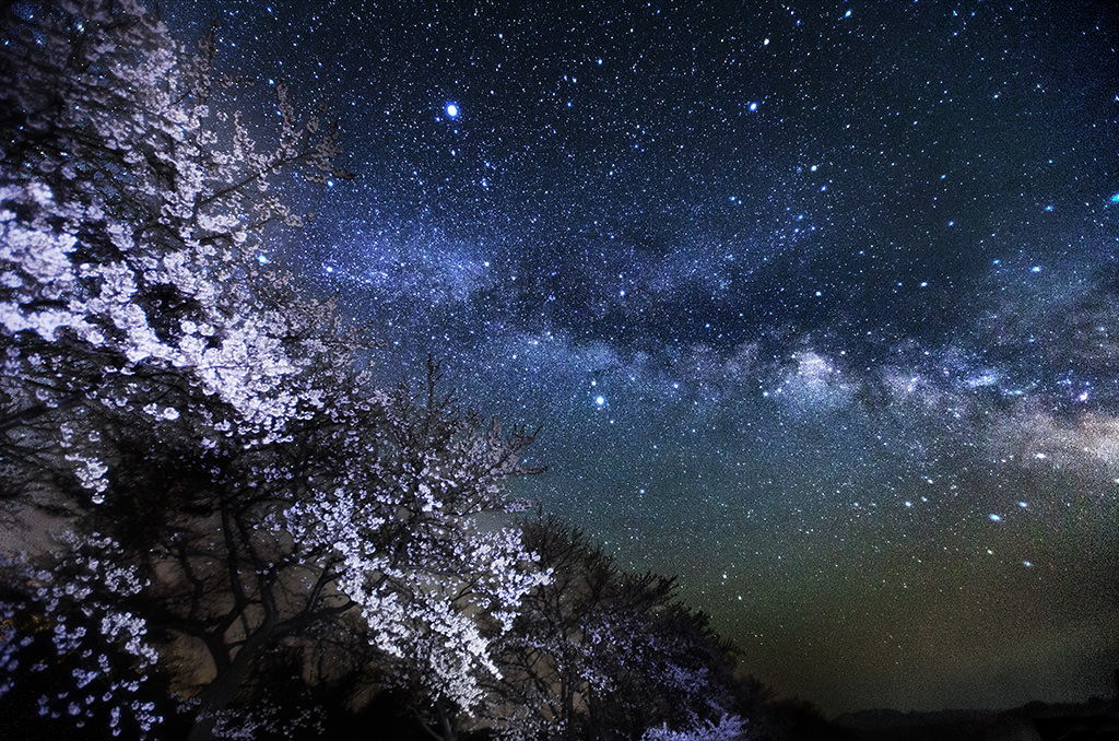 In Japan, cherry blossoms bloom between mid-March and mid-May, starting from the south and gradually moving northwards. Also by May, the Milky Way would be located relatively high up in the sky when it is past midnight. This makes May the time of the year when you can capture the most spectacular view of the Milky Way and the cherry blossoms in a single image.
