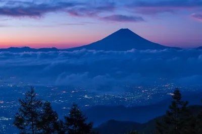 Unique combination of the city lights of the Kofu Basin and Mt. Fuji