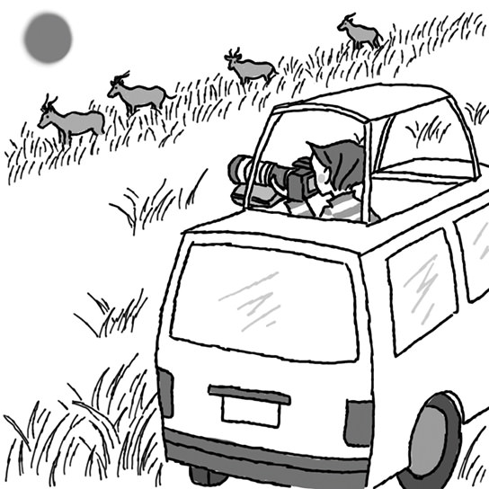 I included the large setting sun in the background, capturing the silhouettes of three topis eating grass . When combining images of animals and the sun with a super telephoto lens, coordination is difficult unless you are located some distance away from the subject . As the size of the sun does not change, take into consideration the size of the subject in searching for a matching shot with the sun.
