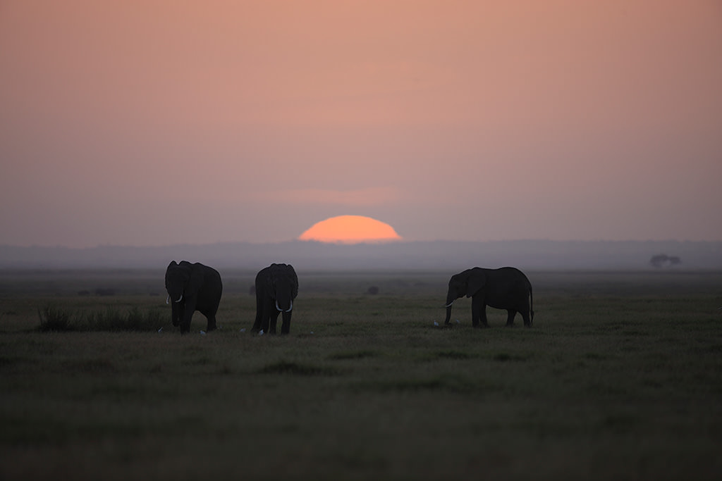 This is one of the close-up shots that I took at 600mm. In the composition, I included African elephants standing in a row and the sun slowly rising from the horizon, while defocusing the grove of trees in the background to a large degree.